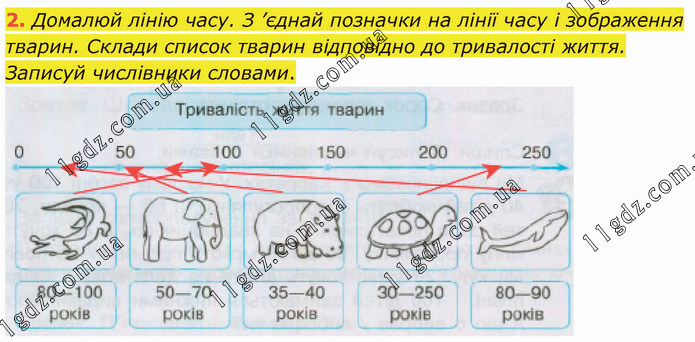 Домалюй лінію часу. З ’єднай позначки на лінії часу і зображення тварин. Склади список тварин відповідно до тривалості життя. Записуй числівники словами.