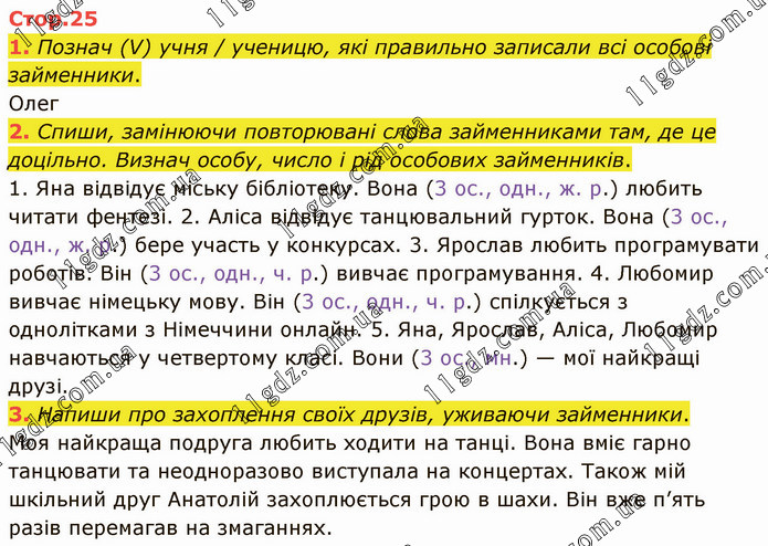 Познач (V) учня / ученицю, які правильно записали всі особові займенники. Олег 2. Спиши, замінюючи повторювані слова займенниками там, де це доцільно. Визнач особу, число і рід особових займенників. 1. Яна відвідує міську бібліотеку. Вона (3 ос., одн., ж. р.) любить читати фентезі. 2. Аліса відвідує танцювальний гурток. Вона (3 ос., одн., ж. р.) бере участь у конкурсах. 3. Ярослав любить програмувати роботів. Він (3 ос., одн., ч. р.) вивчає програмування. 4. Любомир вивчає німецьку мову. Він (3 ос., одн., ч. р.) спілкується з однолітками з Німеччини онлайн. 5. Яна, Ярослав, Аліса, Любомир навчаються у четвертому класі. Вони (3 ос., мн.) — мої найкращі друзі. 3. Напиши про захоплення своїх друзів, уживаючи займенники. Моя найкраща подруга любить ходити на танці. Вона вміє гарно танцювати та неодноразово виступала на концертах. Також мій шкільний друг Анатолій захоплюється грою в шахи. Він вже п’ять разів перемагав на змаганнях.