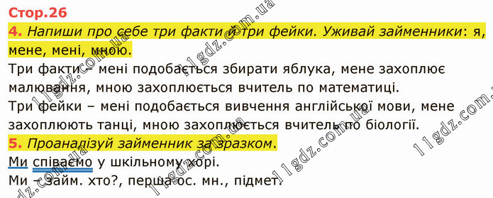 Напиши про себе три факти й три фейки. Уживай займенники: я, мене, мені, мною. Три факти – мені подобається збирати яблука, мене захоплює малювання, мною захоплюється вчитель по математиці. Три фейки – мені подобається вивчення англійської мови, мене захоплюють танці, мною захоплюється вчитель по біології. 5. Проаналізуй займенник за зразком. Ми співаємо у шкільному хорі. Ми – займ. хто?, перша ос. мн., підмет.