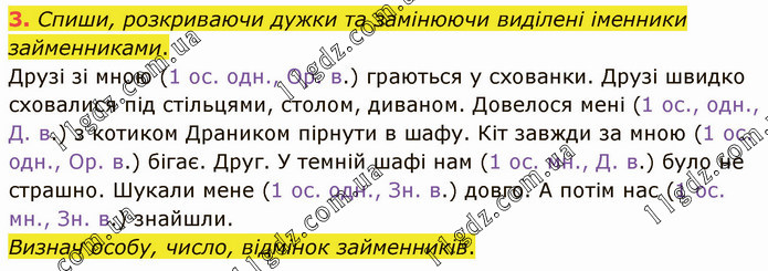 Спиши, розкриваючи дужки та замінюючи виділені іменники займенниками. Друзі зі мною (1 ос. одн., Ор. в.) граються у схованки. Друзі швидко сховалися під стільцями, столом, диваном. Довелося мені (1 ос., одн., Д. в.) з котиком Драником пірнути в шафу. Кіт завжди за мною (1 ос. одн., Ор. в.) бігає. Друг. У темній шафі нам (1 ос. мн., Д. в.) було не страшно. Шукали мене (1 ос. одн., Зн. в.) довго. А потім нас (1 ос. мн., Зн. в.) знайшли. Визнач особу, число, відмінок займенників.