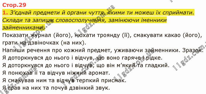 З’єднай предмети й органи чуття, якими ти можеш їх сприймати. Склади та запиши словосполучення, замінюючи іменники займенниками. Показати журнал (його), нюхати троянду (її), смакувати какао (його), грати на дзвіночках (на них). Напиши речення про кожний предмет, уживаючи займенники. Зразок. Я доторкнувся до нього і відчув, що воно гаряче і рідке. Я доторкнувся до нього і відчув, що він м’який та гладкий. Я понюхав її та відчув ніжний аромат. Я смакував ним та відчув терпкий присмак. Я грав на них та почув дзвінкий звук.