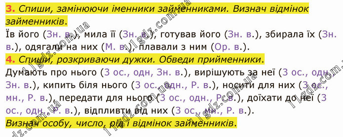 Спиши, замінюючи іменники займенниками. Визнач відмінок займенників. Їв його (Зн. в.), мила її (Зн. в.), готував його (Зн. в.), збирала їх (Зн. в.), одягали на них (М. в.), плавали з ним (Ор. в.). 4. Спиши, розкриваючи дужки. Обведи прийменники. Думають про нього (3 ос., одн, Зн. в.), вирішують за неї (3 ос., одн., Зн. в.), кипить біля нього (3 ос., одн., Р. в.), носити для них (3 ос., мн., Р. в.), передати для нього (3 ос., одн., Р. в.), доїхати до неї (3 ос., одн., Р. в.), відпливти від них (3 ос., мн., Р. в.). Визнач особу, число, рід і відмінок займенників.