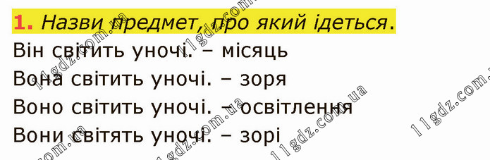 Назви предмет, про який ідеться. Він світить уночі. – місяць Вона світить уночі. – зоря Воно світить уночі. – освітлення Вони світять уночі. – зорі