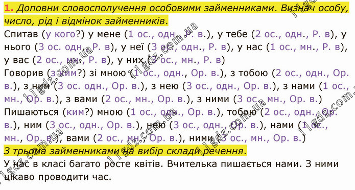 Доповни словосполучення особовими займенниками. Визнач особу, число, рід і відмінок займенників. Спитав (у кого?) у мене (1 ос., одн., Р. в.), у тебе (2 ос., одн., Р. в), у нього (3 ос. одн., Р. в), у неї (3 ос., одн., Р. в), у нас (1 ос., мн., Р. в), у вас (2 ос., мн., Р. в), у них (3 ос., мн., Р. в) Говорив (з ким?) зі мною (1 ос., одн., Ор. в.), з тобою (2 ос., одн., Ор. в.), з ним (3 ос. одн., Ор. в.), з нею (3 ос., одн., Ор. в.), з нами (1 ос., мн., Ор. в.), з вами (2 ос., мн., Ор. в.), з ними (3 ос., мн., Ор. в.) Пишаються (ким?) мною (1 ос., одн., Ор. в.), тобою (2 ос., одн., Ор. в.), ним (3 ос., одн., Ор. в.), нею (3 ос., одн., Ор. в.), нами (1 ос., мн., Ор. в.), вами (2 ос., мн., Ор. в.), ними (3 ос., мн., Ор. в.) З трьома займенниками на вибір склади речення. У нас в класі багато росте квітів. Вчителька пишається нами. З ними цікаво проводити час.