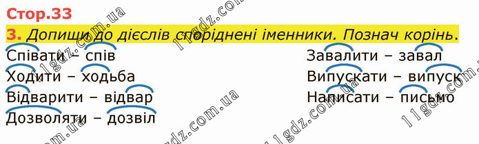Допиши до дієслів споріднені іменники. Познач корінь. Співати – спів Ходити – ходьба Відварити – відвар Дозволяти – дозвіл Завалити – завал Випускати – випуск Написати – письмо