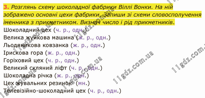 Розглянь схему шоколадної фабрики Віллі Вонки. На ній зображено основні цехи фабрики. Запиши зі схеми словосполучення іменника з прикметником. Визнач число і рід прикметників. Шоколадний цех (ч. р., одн.) Велика жуйкова машина (ж. р., одн.) Льодяникова ковзанка (ж. р., одн.) Ірискова гора (ж. р., одн.) Горіховий цех (ч. р., одн.) Великий скляний ліфт (ч. р., одн.) Шоколадна річка (ж. р., одн.) Цех жувальних резинок (мн.) Телевізійно-шоколадний цех (ч. р., одн.)