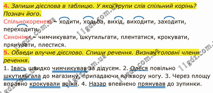 Запиши дієслова в таблицю. У якої групи слів спільний корінь? Познач його. Спільнокореневі – ходити, ходьба, вихід, виходити, заходити, переходити. Синоніми – чимчикувати, шкутильгати, плентатися, крокувати, прямувати, плестися. 5. Обведи влучне дієслово. Спиши речення. Визнач головні члени речення. 1. Івась швидко чимчикував за дідусем. 2. Олеся повільно шкутильгала до магазину, припадаючи на хвору ногу. 3. Через площу вправно крокували воїни. 4. Назар впевнено прямував до зупинки.