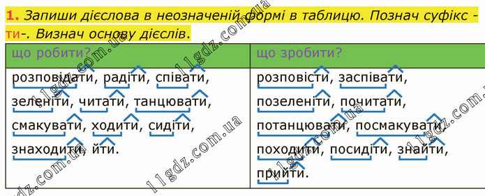 Запиши дієслова в неозначеній формі в таблицю. Познач суфікс -ти-. Визнач основу дієслів.