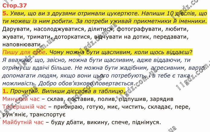 Уяви, що ви з друзями отримали цукертюте. Напиши 10 дієслів, що ти можеш із ним робити. За потреби уживай прикметники й іменники. Дарувати, насолоджуватися, ділитися, фотографувати, любити, жувати, тримати, доторкатися, відчувати на дотик, передавати, наповнювати. Пишу для себе. Чому можна бути щасливим, коли щось віддаєш? Я вважаю, що, звісно, можна бути щасливим, адже віддаючи, ти отримуєш вдвічі більше. Не можна бути жадібним, агресивним, варто допомагати людям, якщо вони цього потребують, і в тебе є така можливість. Добро обов’язково повертається. 1. Прочитай. Випиши дієслова в таблицю. Минулий час – склав, поставив, полив, підпушив, зарядив Теперішній час – прибираю, готую, миє, чистить, складає, пере, рум’яніє, транспортує Майбутній час – буду дбати, викину, спече, піднімуся.