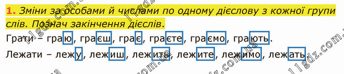 Зміни за особами й числами по одному дієслову з кожної групи слів. Познач закінчення дієслів. Грати – граю, граєш, грає, граєте, граємо, грають. Лежати – лежу, лежиш, лежить, лежите, лежимо, лежать.