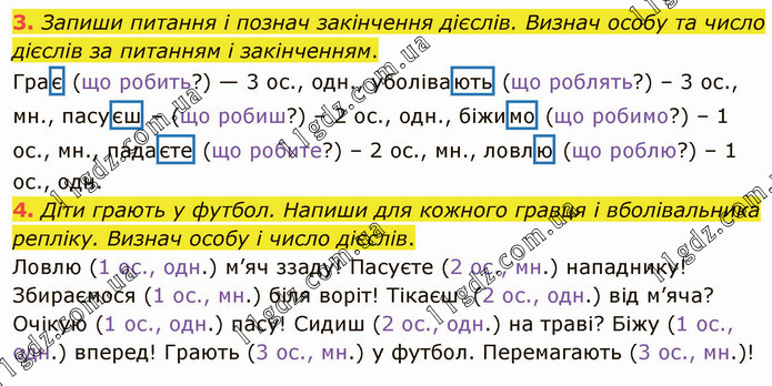 Запиши питання і познач закінчення дієслів. Визнач особу та число дієслів за питанням і закінченням. Грає (що робить?) — 3 ос., одн., уболівають (що роблять?) – 3 ос., мн., пасуєш – (що робиш?) – 2 ос., одн., біжимо (що робимо?) – 1 ос., мн., падаєте (що робите?) – 2 ос., мн., ловлю (що роблю?) – 1 ос., одн. 4. Діти грають у футбол. Напиши для кожного гравця і вболівальника репліку. Визнач особу і число дієслів. Ловлю (1 ос., одн.) м’яч ззаду! Пасуєте (2 ос., мн.) нападнику! Збираємося (1 ос., мн.) біля воріт! Тікаєш (2 ос., одн.) від м’яча? Очікую (1 ос., одн.) пасу! Сидиш (2 ос., одн.) на траві? Біжу (1 ос., одн.) вперед! Грають (3 ос., мн.) у футбол. Перемагають (3 ос., мн.)!