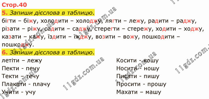 Запиши дієслова в таблицю. бігти – біжу, холодити – холоджу, лягти – лежу, радити – раджу, різати – ріжу, садити – саджу, стерегти – стережу, ходити – ходжу, казати – кажу, їздити – їжджу, возити – вожу, пошкодити – пошкоджу. 6. Запиши дієслова в таблицю. летіти – лежу Пекти - печу Текти – течу Плакати - плачу Учити - учу Косити - кошу Носити - ношу Писати - пишу Просити - прошу Махати – машу