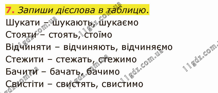 Запиши дієслова в таблицю. Шукати – шукають, шукаємо Стояти – стоять, стоїмо Відчиняти – відчиняють, відчиняємо Стежити – стежать, стежимо Бачити – бачать, бачимо Свистіти – свистять, свистимо
