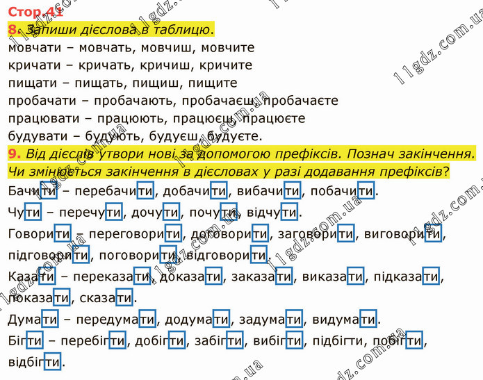 Запиши дієслова в таблицю. мовчати – мовчать, мовчиш, мовчите кричати – кричать, кричиш, кричите пищати – пищать, пищиш, пищите пробачати – пробачають, пробачаєш, пробачаєте працювати – працюють, працюєш, працюєте будувати – будують, будуєш, будуєте. 9. Від дієслів утвори нові за допомогою префіксів. Познач закінчення. Чи змінюється закінчення в дієсловах у разі додавання префіксів? Бачити – перебачити, добачити, вибачити, побачити. Чути – перечути, дочути, почути, відчути. Говорити – переговорити, договорити, заговорити, виговорити, підговорити, поговорити, відговорити. Казати – переказати, доказати, заказати, виказати, підказати, показати, сказати. Думати – передумати, додумати, задумати, видумати. Бігти – перебігти, добігти, забігти, вибігти, підбігти, побігти, відбігти.