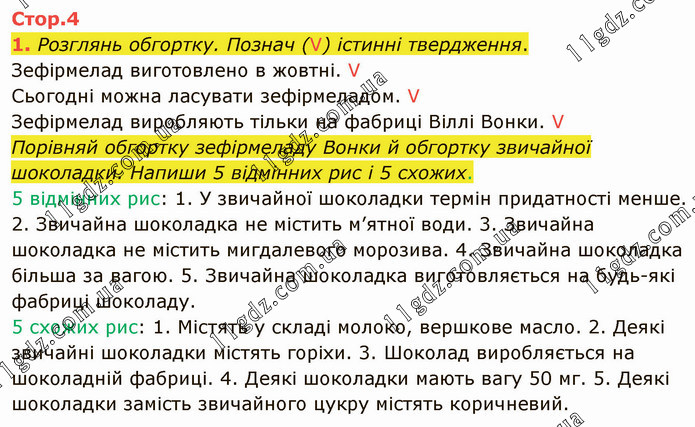 Розглянь обгортку. Познач (V) істинні твердження. Зефірмелад виготовлено в жовтні. V Сьогодні можна ласувати зефірмеладом. V Зефірмелад виробляють тільки на фабриці Віллі Вонки. V Порівняй обгортку зефірмеладу Вонки й обгортку звичайної шоколадки. Напиши 5 відмінних рис і 5 схожих. 5 відмінних рис: 1. У звичайної шоколадки термін придатності менше. 2. Звичайна шоколадка не містить м’ятної води. 3. Звичайна шоколадка не містить мигдалевого морозива. 4. Звичайна шоколадка більша за вагою. 5. Звичайна шоколадка виготовляється на будь-які фабриці шоколаду. 5 схожих рис: 1. Містять у складі молоко, вершкове масло. 2. Деякі звичайні шоколадки містять горіхи. 3. Шоколад виробляється на шоколадній фабриці. 4. Деякі шоколадки мають вагу 50 мг. 5. Деякі шоколадки замість звичайного цукру містять коричневий.
