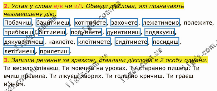 Устав у слова е/є чи и/ї. Обведи дієслова, які позначають незавершену дію. Побачиш, бачитимеш, хотітимете, захочете, лежатимемо, полежите, прибіжиш, бігтимеш, подумаєте, думатимеш, подякуєш, дякуватимеш, наклеїте, клеїтимете, сидітимете, посидиш, летітимеш, прилетиш. 3. Запиши речення за зразком, ставлячи дієслова в 2 особу однини. Ти весело співаєш. Ти мовчиш на уроках. Ти старанно пишеш. Ти вчиш правила. Ти лікуєш хворих. Ти голосно кричиш. Ти граєш м’ячем.