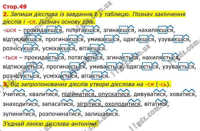 Запиши дієслова із завдання 1 у таблицю. Познач закінчення дієслів і -ся. Познач основу слів. -шся – прокидаєшся, потягаєшся, згинаєшся, нахиляєшся, відтискаєшся, прогинаєшся, умиваєшся, одягаєшся, узуваєшся, розчісуєшся, усміхаєшся, вітаєшся. -ться – прокидається, потягається, згинається, нахиляється, відтискається, прогинається, умивається, одягається, узувається, розчісується, усміхається, вітається. 3. Від запропонованих дієслів утвори дієслова на -ся (-сь). Учитися, хвалитися, підійматися, опускатися, дивуватися, ховатися, знаходитися, запасатися, зігрітися, охолодитися, вітатися, зупинитися, розпочинатися, залишатися. З’єднай лінією дієслова-антоніми.