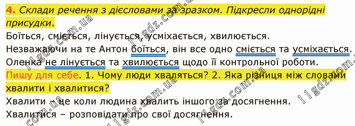 Склади речення з дієсловами за зразком. Підкресли однорідні присудки. Боїться, сміється, лінується, усміхається, хвилюється. Незважаючи на те Антон боїться, він все одно сміється та усміхається. Оленка не лінується та хвилюється щодо її контрольної роботи. Пишу для себе. 1. Чому люди хваляться? 2. Яка різниця між словами хвалити і хвалитися? Хвалити – це коли людина хвалить іншого за досягнення. Хвалитися – розповідати про свої досягнення.