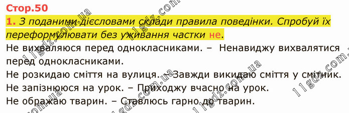 З поданими дієсловами склади правила поведінки. Спробуй їх переформулювати без уживання частки не. Не вихваляюся перед однокласниками. – Ненавиджу вихвалятися перед однокласниками. Не розкидаю сміття на вулиця. – Завжди викидаю сміття у смітник. Не запізнююся на урок. – Приходжу вчасно на урок. Не ображаю тварин. – Ставлюсь гарно до тварин.