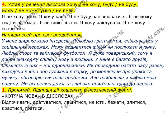 . Устав у речення дієслова хочу / не хочу, буду / не буду, можу / не можу, умію / не вмію. Я не хочу пити. Я хочу каші. Я не буду запізнюватися. Я не можу сидіти на хмарі. Я не вмію літати. Я хочу чаклувати. Я не хочу сваритися. Напиши есей про свої вподобання. У мене широке коло інтересів. Я люблю грати в ігри, спілкуватися у соціальних мережах. Можу подивитися фільм чи послухати музику. Люблю спорт та займаюся футболом. Я дуже товариський, тому я добре знаходжу спільну мову з людьми. У мене є багато друзів, більшість із них – мої однокласники. Ми проводимо багато часу разом, виходячи в кіно або гуляючи в парку, розмовляючи про уроки та музику, обговорюючи наші проблеми. Але найбільше я люблю мою родину. Ми всі великі друзі та глибоко прив'язані один до одного. 1. Прочитай. Підпиши дії кошеняти в неозначеній формі. «КОТЯЧА МОВА» В ДІЄСЛОВАХ Відпочивати, дратуватися, лащитися, не їсти, лежати, злитися, крастися, гратися.