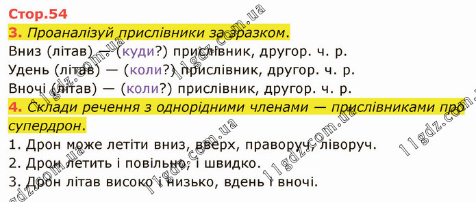 Проаналізуй прислівники за зразком. Вниз (літав) — (куди?) прислівник, другор. ч. р. Удень (літав) — (коли?) прислівник, другор. ч. р. Вночі (літав) — (коли?) прислівник, другор. ч. р. 4. Склади речення з однорідними членами — прислівниками про супердрон. 1. Дрон може летіти вниз, вверх, праворуч, ліворуч. 2. Дрон летить і повільно, і швидко. 3. Дрон літав високо і низько, вдень і вночі.