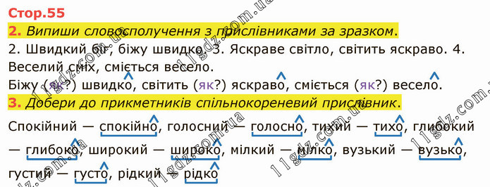 Випиши словосполучення з прислівниками за зразком. 2. Швидкий біг, біжу швидко. 3. Яскраве світло, світить яскраво. 4. Веселий сміх, сміється весело. Біжу (як?) швидко, світить (як?) яскраво, сміється (як?) весело. 3. Добери до прикметників спільнокореневий прислівник. Спокійний — спокійно, голосний — голосно, тихий — тихо, глибокий — глибоко, широкий — широко, мілкий — мілко, вузький — вузько, густий — густо, рідкий — рідко
