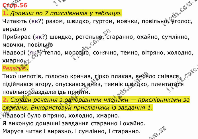 Допиши по 7 прислівників у таблицю. Читають (як?) разом, швидко, гуртом, мовчки, повільно, уголос, виразно Прибирає (як?) швидко, ретельно, старанно, охайно, сумлінно, мовчки, повільно Надворі (як?) тепло, морозно, сонячно, темно, вітряно, холодно, хмарно. Редагую. Тихо шепотів, голосно кричав, гірко плакав, весело сміявся, підіймався вгору, опускався вниз, темніє швидко, плентатися повільно, заздалегідь прийти. 2. Склади речення з однорідними членами — прислівниками за схемами. Використовуй прислівники із завдання 1. Надворі було вітряно, холодно, хмарно. Я виконую домашні завдання старанно і охайно. Маруся читає і виразно, і сумлінно, і старанно.