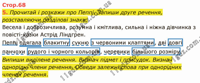 Прочитай і розкажи про Пеппі. Запиши друге речення, розставляючи розділові знаки. Весела і доброзичлива, розумна і кмітлива, сильна і ніжна дівчинка з повісті-казки Астрід Ліндгрен. Пеппі одягала блакитну сукню з червоними клаптями, дві довгі панчохи рудого і чорного кольорів, черевики більшого розміру. Випиши виділене речення. Визнач підмет і присудок. Визнач однорідні члени речення. Обведи залежні слова при однорідних членах речення.