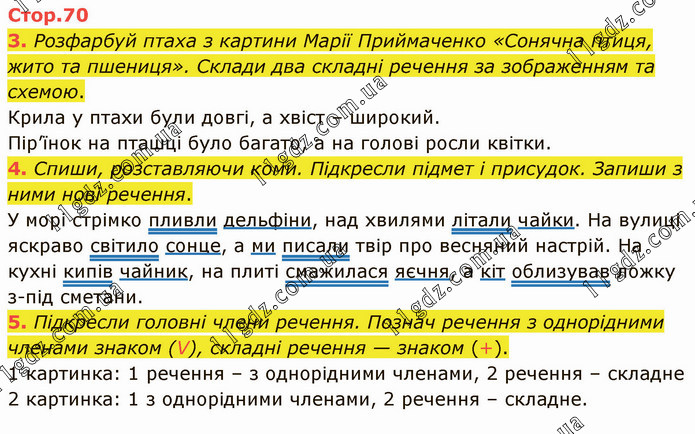 Розфарбуй птаха з картини Марії Приймаченко «Сонячна птиця, жито та пшениця». Склади два складні речення за зображенням та схемою. Крила у птахи були довгі, а хвіст – широкий. Пір’їнок на пташці було багато, а на голові росли квітки. 4. Спиши, розставляючи коми. Підкресли підмет і присудок. Запиши з ними нові речення. У морі стрімко пливли дельфіни, над хвилями літали чайки. На вулиці яскраво світило сонце, а ми писали твір про весняний настрій. На кухні кипів чайник, на плиті смажилася яєчня, а кіт облизував ложку з-під сметани. 5. Підкресли головні члени речення. Познач речення з однорідними членами знаком (V), складні речення — знаком (+). 1 картинка: 1 речення – з однорідними членами, 2 речення – складне 2 картинка: 1 з однорідними членами, 2 речення – складне.