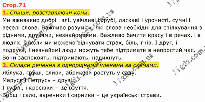 Спиши, розставляючи коми. Ми вживаємо добрі і злі, увічливі і грубі, ласкаві і урочисті, сумні і веселі слова. Важливо розуміти, які слова необхідні для спілкування з рідними, друзями, незнайомцями. Важливо бачити красу і в речах, і в людях. Інколи ми можемо відчувати страх, біль, гнів. І друг, і подруга, і незнайомі люди можуть тебе підтримати в непростий час. Вони заспокоять, підтримають, надихнуть. 2. Склади речення з однорідними членами за схемами. Яблука, груші, сливи, абрикоси ростуть у саду. Маруся і Петрусь – друзі. І туфлі, і кросівки – це взуття. Борщ і сало, вареники і сирники – це українські страви.
