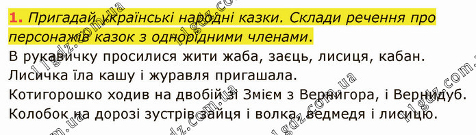 Пригадай українські народні казки. Склади речення про персонажів казок з однорідними членами. В рукавичку просилися жити жаба, заєць, лисиця, кабан. Лисичка їла кашу і журавля пригашала. Котигорошко ходив на двобій зі Змієм з Вернигора, і Вернидуб. Колобок на дорозі зустрів зайця і волка, ведмедя і лисицю.
