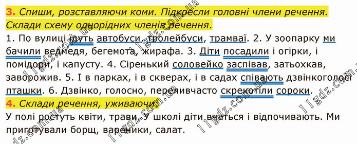 Спиши, розставляючи коми. Підкресли головні члени речення. Склади схему однорідних членів речення. 1. По вулиці їдуть автобуси, тролейбуси, трамваї. 2. У зоопарку ми бачили ведмедя, бегемота, жирафа. 3. Діти посадили і огірки, і помідори, і капусту. 4. Сіренький соловейко заспівав, затьохкав, заворожив. 5. І в парках, і в скверах, і в садах співають дзвінкоголосі пташки. 6. Дзвінко, голосно, переливчасто скрекотіли сороки. 4. Склади речення, уживаючи: У полі ростуть квіти, трави. У школі діти вчаться і відпочивають. Ми приготували борщ, вареники, салат.