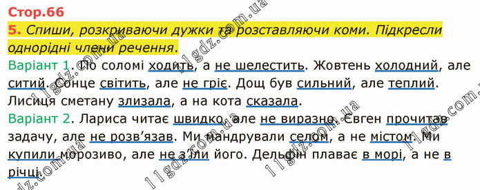 Спиши, розкриваючи дужки та розставляючи коми. Підкресли однорідні члени речення. Варіант 1. По соломі ходить, а не шелестить. Жовтень холодний, але ситий. Сонце світить, але не гріє. Дощ був сильний, але теплий. Лисиця сметану злизала, а на кота сказала. Варіант 2. Лариса читає швидко, але не виразно. Євген прочитав задачу, але не розв’язав. Ми мандрували селом, а не містом. Ми купили морозиво, але не з’їли його. Дельфін плаває в морі, а не в річці.
