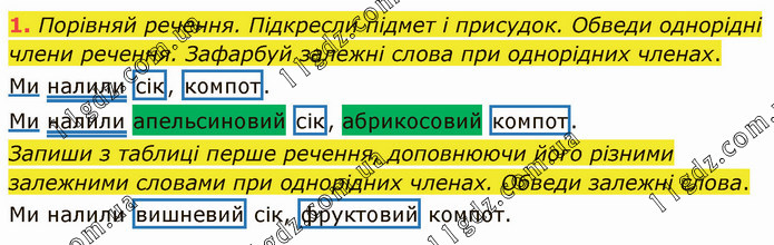 Порівняй речення. Підкресли підмет і присудок. Обведи однорідні члени речення. Зафарбуй залежні слова при однорідних членах. Ми налили сік, компот. Ми налили апельсиновий сік, абрикосовий компот. Запиши з таблиці перше речення, доповнюючи його різними залежними словами при однорідних членах. Обведи залежні слова. Ми налили вишневий сік, фруктовий компот.