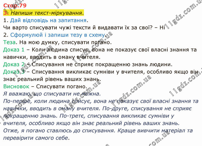 Напиши текст-міркування. 1. Дай відповідь на запитання. Чи варто списувати чужі тексти й видавати їх за свої? – Ні 2. Сформулюй і запиши тезу в схему. Теза. На мою думку, списувати погано. Доказ 1 – Коли людина списує, вона не показує свої власні знання та навички, вводить в оману вчителя. Доказ 2 – Списування не сприяє покращенню знань людини. Доказ 3 – Списування викликає сумніви у вчителя, особливо якщо він знає реальний рівень ваших знань. Висновок – Списувати погано. Я вважаю, що списувати не можна. По-перше, коли людина списує, вона не показує свої власні знання та навички, вводить в оману вчителя. По-друге, списування не сприяє покращенню знань. По-третє, списування викликає сумніви у вчителя, особливо якщо він знає реальний рівень ваших знань. Отже, я погано ставлюсь до списування. Краще вивчити матеріал та перевірити самого себе.
