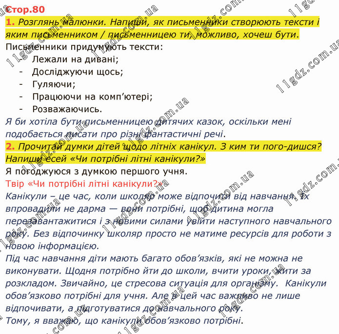 Розглянь малюнки. Напиши, як письменники створюють тексти і яким письменником / письменницею ти, можливо, хочеш бути. Письменники придумують тексти: - Лежали на дивані; - Досліджуючи щось; - Гуляючи; - Працюючи на комп’ютері; - Розважаючись. Я би хотіла бути письменницею дитячих казок, оскільки мені подобається писати про різні фантастичні речі. 2. Прочитай думки дітей щодо літніх канікул. З ким ти погодишся? Напиши есей «Чи потрібні літні канікули?» Я погоджуюся з думкою першого учня. Твір «Чи потрібні літні канікули?» Канікули – це час, коли школяр може відпочити від навчання. Їх впровадили не дарма — вони потрібні, щоб дитина могла перезавантажитися і з новими силами увійти наступного навчального року. Без відпочинку школяр просто не матиме ресурсів для роботи з новою інформацією. Під час навчання діти мають багато обов’язків, які не можна не виконувати. Щодня потрібно йти до школи, вчити уроки, жити за розкладом. Звичайно, це стресова ситуація для організму. Канікули обов’язково потрібні для учня. Але в цей час важливо не лише відпочивати, а підготуватися до навчального року. Тому, я вважаю, що канікули обов’язково потрібні.