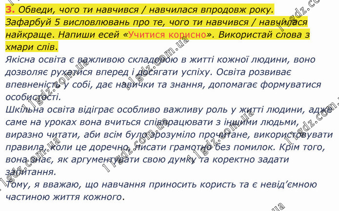 Обведи, чого ти навчився / навчилася впродовж року. Зафарбуй 5 висловлювань про те, чого ти навчився / навчилася найкраще. Напиши есей «Учитися корисно». Використай слова з хмари слів. Якісна освіта є важливою складовою в житті кожної людини, воно дозволяє рухатися вперед і досягати успіху. Освіта розвиває впевненість у собі, дає навички та знання, допомагає формуватися особистості. Шкільна освіта відіграє особливо важливу роль у житті людини, адже саме на уроках вона вчиться співпрацювати з іншими людьми, виразно читати, аби всім було зрозуміло прочитане, використовувати правила, коли це доречно, писати грамотно без помилок. Крім того, вона знає, як аргументувати свою думку та коректно задати запитання. Тому, я вважаю, що навчання приносить користь та є невід’ємною частиною життя кожного.