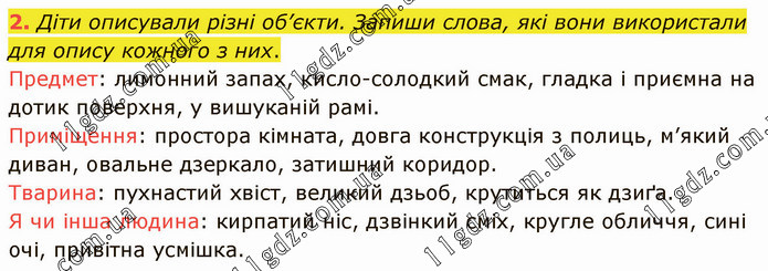 Діти описували різні об’єкти. Запиши слова, які вони використали для опису кожного з них. Предмет: лимонний запах, кисло-солодкий смак, гладка і приємна на дотик поверхня, у вишуканій рамі. Приміщення: простора кімната, довга конструкція з полиць, м’який диван, овальне дзеркало, затишний коридор. Тварина: пухнастий хвіст, великий дзьоб, крутиться як дзиґа. Я чи інша людина: кирпатий ніс, дзвінкий сміх, кругле обличчя, сині очі, привітна усмішка.