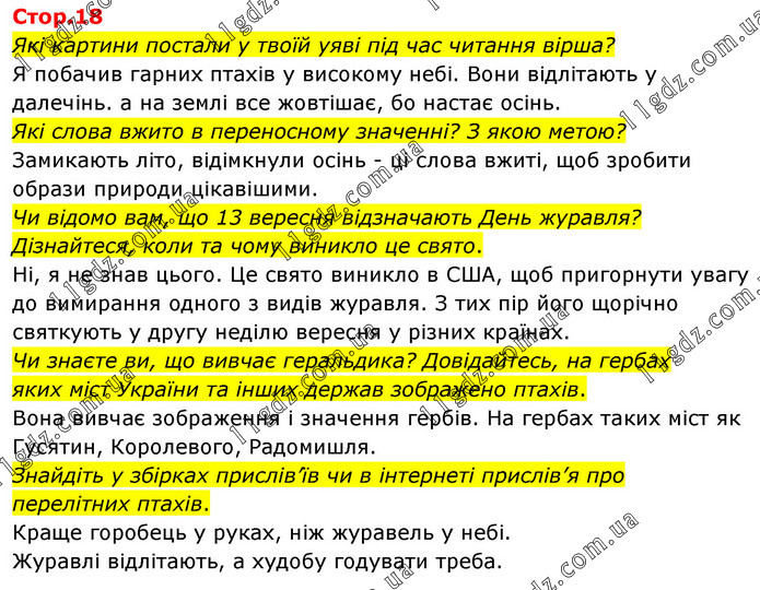 Які картини постали у твоїй уяві під час читання вірша? Я побачив гарних птахів у високому небі. Вони відлітають у далечінь. а на землі все жовтішає, бо настає осінь. Які слова вжито в переносному значенні? З якою метою? Замикають літо, відімкнули осінь - ці слова вжиті, щоб зробити образи природи цікавішими. Чи відомо вам, що 13 вересня відзначають День журавля? Дізнайтеся, коли та чому виникло це свято. Ні, я не знав цього. Це свято виникло в США, щоб пригорнути увагу до вимирання одного з видів журавля. З тих пір його щорічно святкують у другу неділю вересня у різних країнах. Чи знаєте ви, що вивчає геральдика? Довідайтесь, на гербах яких міст України та інших держав зображено птахів. Вона вивчає зображення і значення гербів. На гербах таких міст як Гусятин, Королевого, Радомишля. Знайдіть у збірках прислів’їв чи в інтернеті прислів’я про перелітних птахів. Краще горобець у руках, ніж журавель у небі. Журавлі відлітають, а худобу годувати треба.