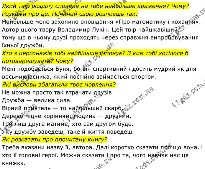 Який твір розділу справив на тебе найбільше враження? Чому? Розкажи про це. Починай свою розповідь так: Найбільше мене захопило оповідання «Про математику і кохання». Автор цього твору Володимир Лукін. Цей твір найцікавіший, тому що в ньому друзі проходять через справжня випробовування їхньої дружби. Хто з персонажів тобі найбільше імпонує? З ким тобі хотілося б потоваришувати? Чому? Мені подобається Буня, бо він спортивний і досить мудрий як для восьмикласника, який постійно займається спортом. Які вислови збагатили твоє мовлення? Не можна просто так втрачати друзів Дружба — велика сила. Вірний приятель — то найбільший скарб. Дерево міцне корінням, людина — друзями. Той лиш друга матиме, хто сам другом буде. Яку дружбу заведеш, таке й життя поведеш. Як розказати про прочитану книгу? Треба вказани назву її, автора. Далі коротко сказати про що вона, і хто її головні герої. Можна сказати і про те, чого навчає нас ця книжка.
