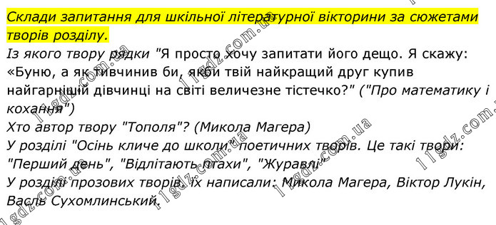 Склади запитання для шкільної літературної вікторини за сюжетами творів розділу. Із якого твору рядки "Я просто хочу запитати його дещо. Я скажу: «Буню, а як тивчинив би, якби твій найкращий друг купив найгарнішій дівчинці на світі величезне тістечко?" ("Про математику і кохання") Хто автор твору "Тополя"? (Микола Магера) У розділі "Осінь кличе до школи" поетичних творів. Це такі твори: "Перший день", "Відлітають птахи", "Журавлі" У розділі прозових творів. їх написали: Микола Магера, Віктор Лукін, Васль Сухомлинський.