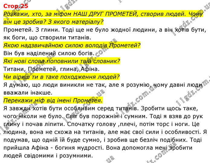 Розкажи, хто, за міфом НАШ ДРУГ ПРОМЕТЕЙ, створив людей. Чому він це зробив? З якого матеріалу? Прометей. З глини. Тоді ще не було жодної людини, а він хотів бути, як боги, що створили титанів. Якою надзвичайною силою володів Прометей? Він був наділений силою богів. Які нові слова поповнили твій словник? Титани, Прометей, глина, Афіна. Чи віриш ти в таке походження людей? Я думаю, що люди виникли не так, але я розумію, чому давні люди вважали інакше. Перекажи міф від імені Прометея. Я завжди хотів бути особливим серед титанів. Зробити щось таке, чого ніколи не було. Світ був порожнім і сумним. Тоді я взяв до рук глину і почав ліпити. Спочатку голову ,плечі, потім торс і ноги. Це людина, вона не схожа на титанів, але має свої сили і особливості. Я подумав, що одній їй буде сумно, і зробив ще безліч подібних. Тоді прийшла Афіна - богиня мудрості. Вона допомогла мені зробити людей свідомими і розумними.