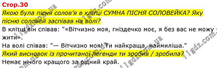Якою була пісня солов’я в клітці СУМНА ПІСНЯ СОЛОВЕЙКА? Яку пісню соловей заспівав на волі? В клітці він співав: "«Вітчизно моя, гніздечко моє, я без вас не можу жити». На волі співав: "— Вітчизно моя! Ти найкраща, наймиліша." Який висновок із прочитаної легенди ти зробив / зробила? Немає нічого кращого за рідний край.