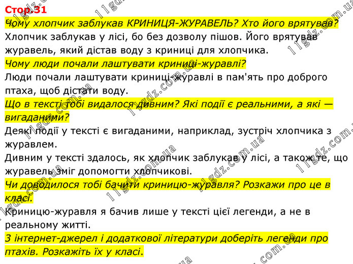 Чому хлопчик заблукав КРИНИЦЯ-ЖУРАВЕЛЬ? Хто його врятував? Хлопчик заблукав у лісі, бо без дозволу пішов. Його врятував журавель, який дістав воду з криниці для хлопчика. Чому люди почали лаштувати криниці-журавлі? Люди почали лаштувати криниці-журавлі в пам'ять про доброго птаха, щоб дістати воду. Що в тексті тобі видалося дивним? Які події є реальними, а які — вигаданими? Деякі події у тексті є вигаданими, наприклад, зустріч хлопчика з журавлем. Дивним у тексті здалось, як хлопчик заблукав у лісі, а також те, що журавель зміг допомогти хлопчикові. Чи доводилося тобі бачити криницю-журавля? Розкажи про це в класі. Криницю-журавля я бачив лише у тексті цієї легенди, а не в реальному житті. 3 інтернет-джерел і додаткової літератури доберіть легенди про птахів. Розкажіть їх у класі.