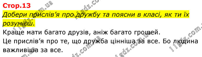 Добери прислів’я про дружбу та поясни в класі, як ти їх розумієш. Краще мати багато друзів, аніж багато грошей. Це прислів’я про те, що дружба цінніша за все. Бо людина важливіша за все.