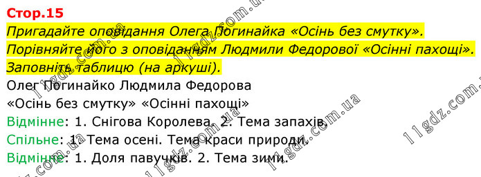 Пригадайте оповідання Олега Погинайка «Осінь без смутку». Порівняйте його з оповіданням Людмили Федорової «Осінні пахощі». Заповніть таблицю (на аркуші). Олег Погинайко Людмила Федорова «Осінь без смутку» «Осінні пахощі» Відмінне: 1. Снігова Королева. 2. Тема запахів. Спільне: 1. Тема осені. Тема краси природи. Відмінне: 1. Доля павучків. 2. Тема зими.