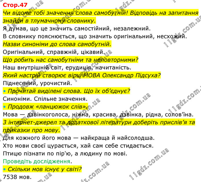 Чи відоме тобі значення слова самобутній! Відповідь на запитання знайди в тлумачному словнику. Я думав, що це значить самостійний, незалежний. В словнику пояснюється, що значить оригінальний, несхожий. Назви синоніми до слова самобутній. Оригінальний, справжній, цікавий. Що робить нас самобутніми та неповторними? Наш внутрішній світ, ерудиція, начитаність. Який настрій створює вірш МОВА Олександр Підсуха? Піднесений, урочистий. • Прочитай виділені слова. Що їх об’єднує? Синоніми. Спільне значення. • Продовж «ланцюжок слів». Мова — дзвінкоголоса, ніжна, красива, дзвінка, рідна, солов’їна. 3 інтернет-джерел та додаткової літератури доберіть прислів’я та приказки про мову. Для кожного його мова — найкраща й найсолодша. Хто мови своєї цурається, хай сам себе стидається. Птицю пізнати по пір'ю, а людину по мові. Проведіть дослідження. • Скільки мов існує у світі? 7538 мов.