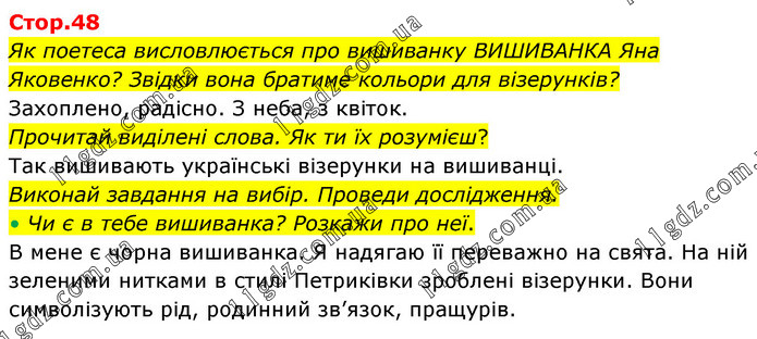 Як поетеса висловлюється про вишиванку ВИШИВАНКА Яна Яковенко? Звідки вона братиме кольори для візерунків? Захоплено, радісно. З неба, з квіток. Прочитай виділені слова. Як ти їх розумієш? Так вишивають українські візерунки на вишиванці. Виконай завдання на вибір. Проведи дослідження. • Чи є в тебе вишиванка? Розкажи про неї. В мене є чорна вишиванка. Я надягаю її переважно на свята. На ній зеленими нитками в стилі Петриківки зроблені візерунки. Вони символізують рід, родинний зв’язок, пращурів.
