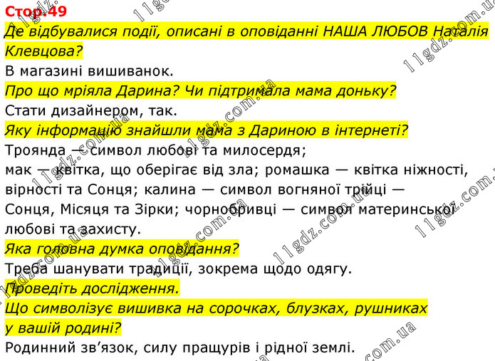 Де відбувалися події, описані в оповіданні НАША ЛЮБОВ Наталія Клевцова? В магазині вишиванок. Про що мріяла Дарина? Чи підтримала мама доньку? Стати дизайнером, так. Яку інформацію знайшли мама з Дариною в інтернеті? Троянда — символ любові та милосердя; мак — квітка, що оберігає від зла; ромашка — квітка ніжності, вірності та Сонця; калина — символ вогняної трійці — Сонця, Місяця та Зірки; чорнобривці — символ материнської любові та захисту. Яка головна думка оповідання? Треба шанувати традиції, зокрема щодо одягу. Проведіть дослідження. Що символізує вишивка на сорочках, блузках, рушниках у вашій родині? Родинний зв’язок, силу пращурів і рідної землі.