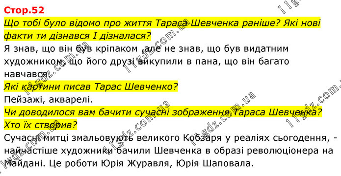 Що тобі було відомо про життя Тараса Шевченка раніше? Які нові факти ти дізнався І дізналася? Я знав, що він був кріпаком, але не знав, що був видатним художником, що його друзі викупили в пана, що він багато навчався. Які картини писав Тарас Шевченко? Пейзажі, акварелі. Чи доводилося вам бачити сучасні зображення Тараса Шевченка? Хто їх створив? Сучасні митці змальовують великого Кобзаря у реаліях сьогодення, - найчастіше художники бачили Шевченка в образі революціонера на Майдані. Це роботи Юрія Журавля, Юрія Шаповала.